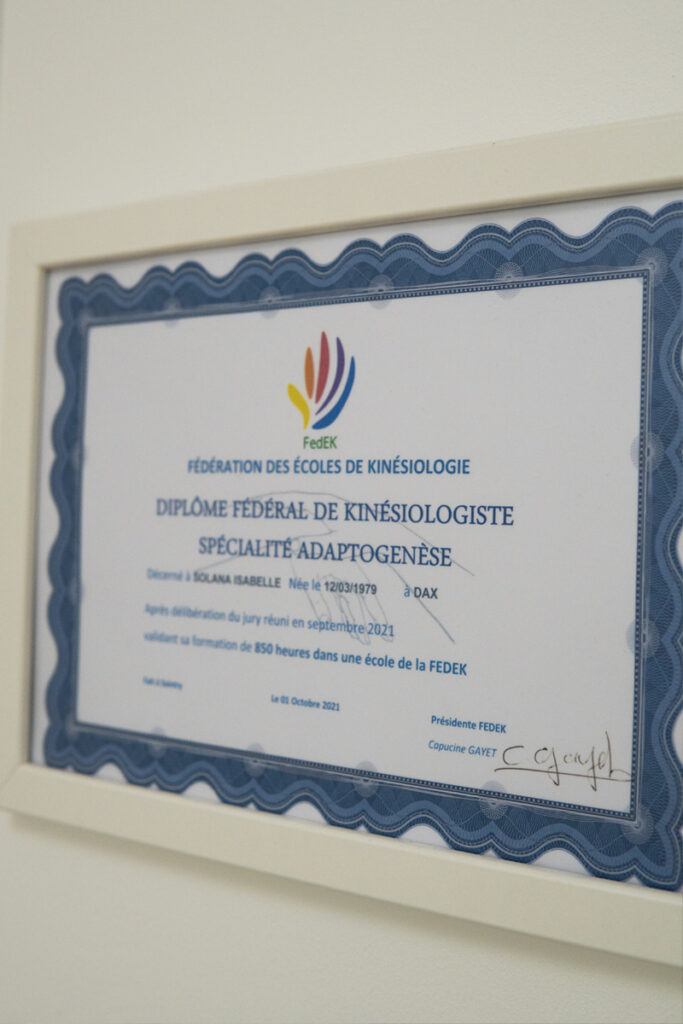 Je suis certifiée en tant que kinésiologue spécialisée en adaptogenèse après 1200h de formation ( diplôme délivré par la FEDEK Fédération Des Ecoles de Kinésiologie) effectuées à l’EDutm.